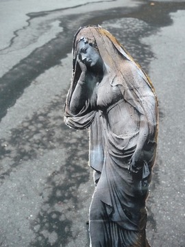Description: The Action Researcher/Performer photographed different human figures seen on the streets of Paris, in the form of- statues, memorials, or represented in paste-ups and graffiti. The photographs were then printed in black and white, partially painted and stained, then pasted onto card and cut out. The scaled-down figures were then positioned back in the city, standing directly on the stained parts of footpaths. The proliferation and range of stains that mark the footpaths of Paris are caused by running liquid, most commonly, dog urination. These city figures could be seen rising up from the moist surface, ruling over this every-changing miniature urban landscape.